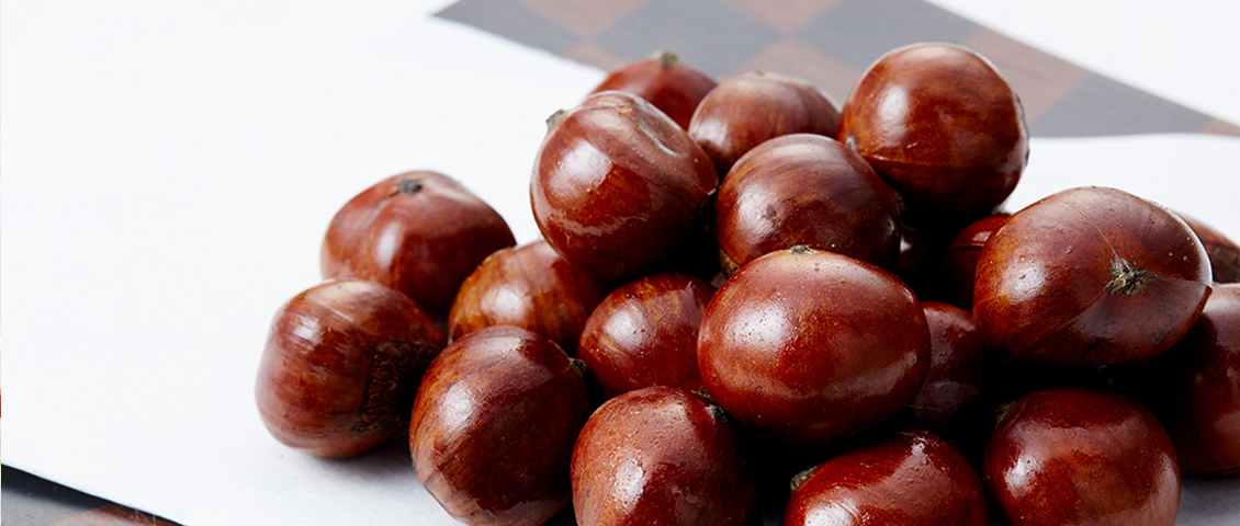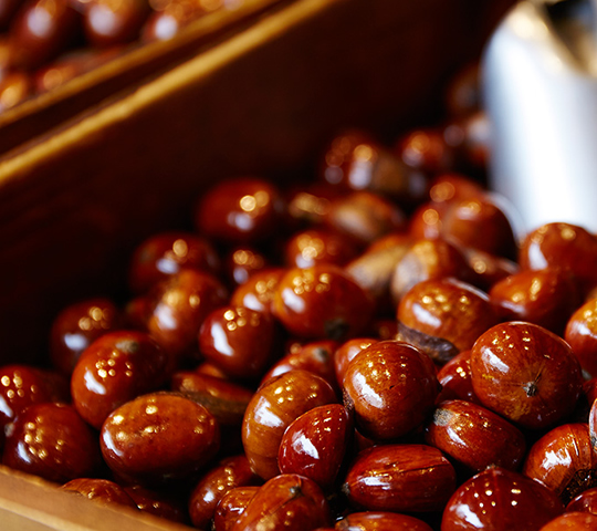 「河北栗子」は栄養豊富で果肉の甘みがしっかりとしており、また渋皮(外側の硬い殻と実の間にある薄い皮)が剥きやすいため甘栗には最適です。栗は収穫時期ごとに早生栗、中生栗、晩生栗の3つに分類され、その中でも中生栗が最も甘栗に適しているため、当店ではこれを使用しています。